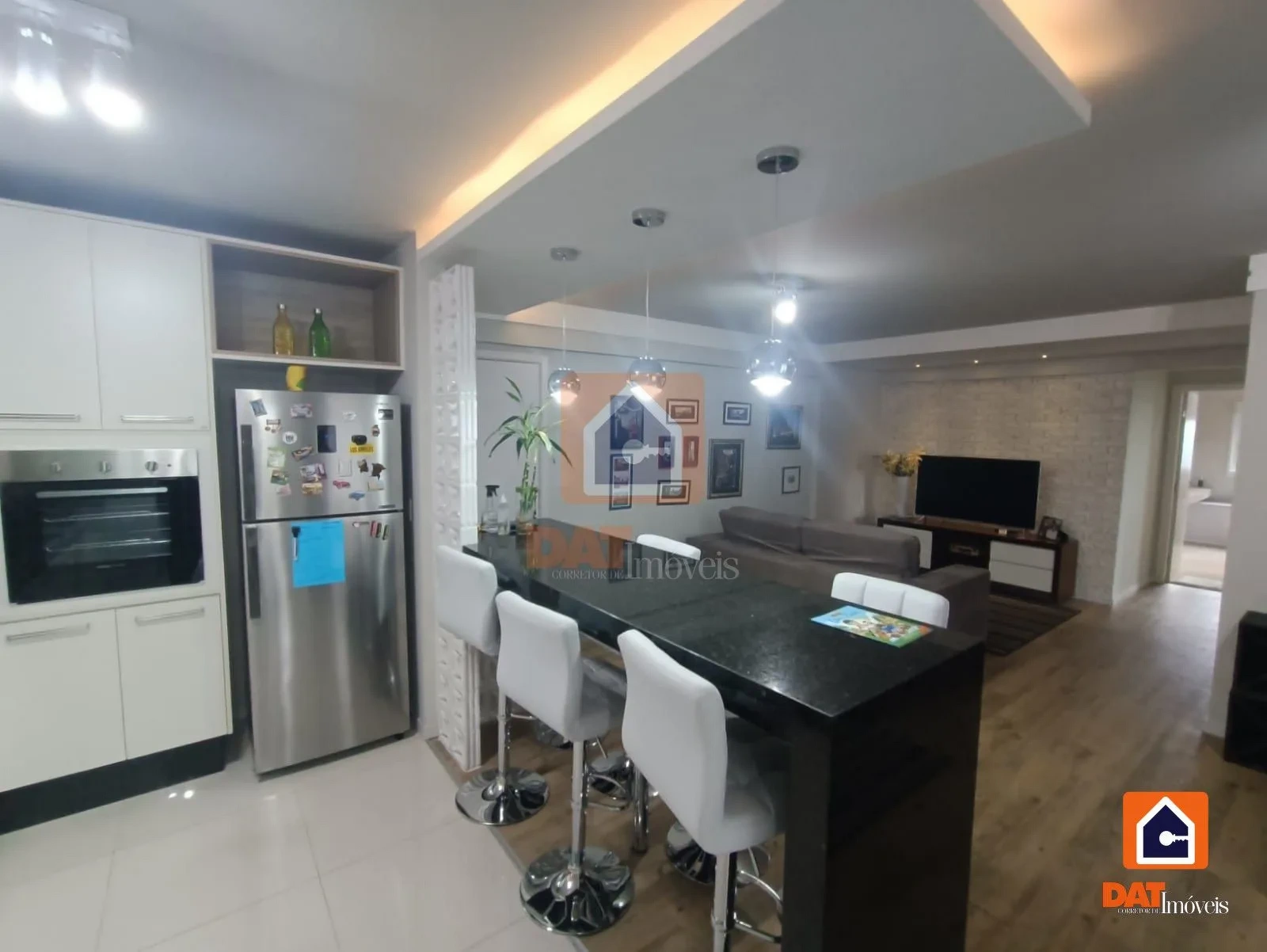 A sala de estar para 2 ambientes, com um espaço amplo e luminoso, combinado com a cozinha no estilo americano e lavanderia;