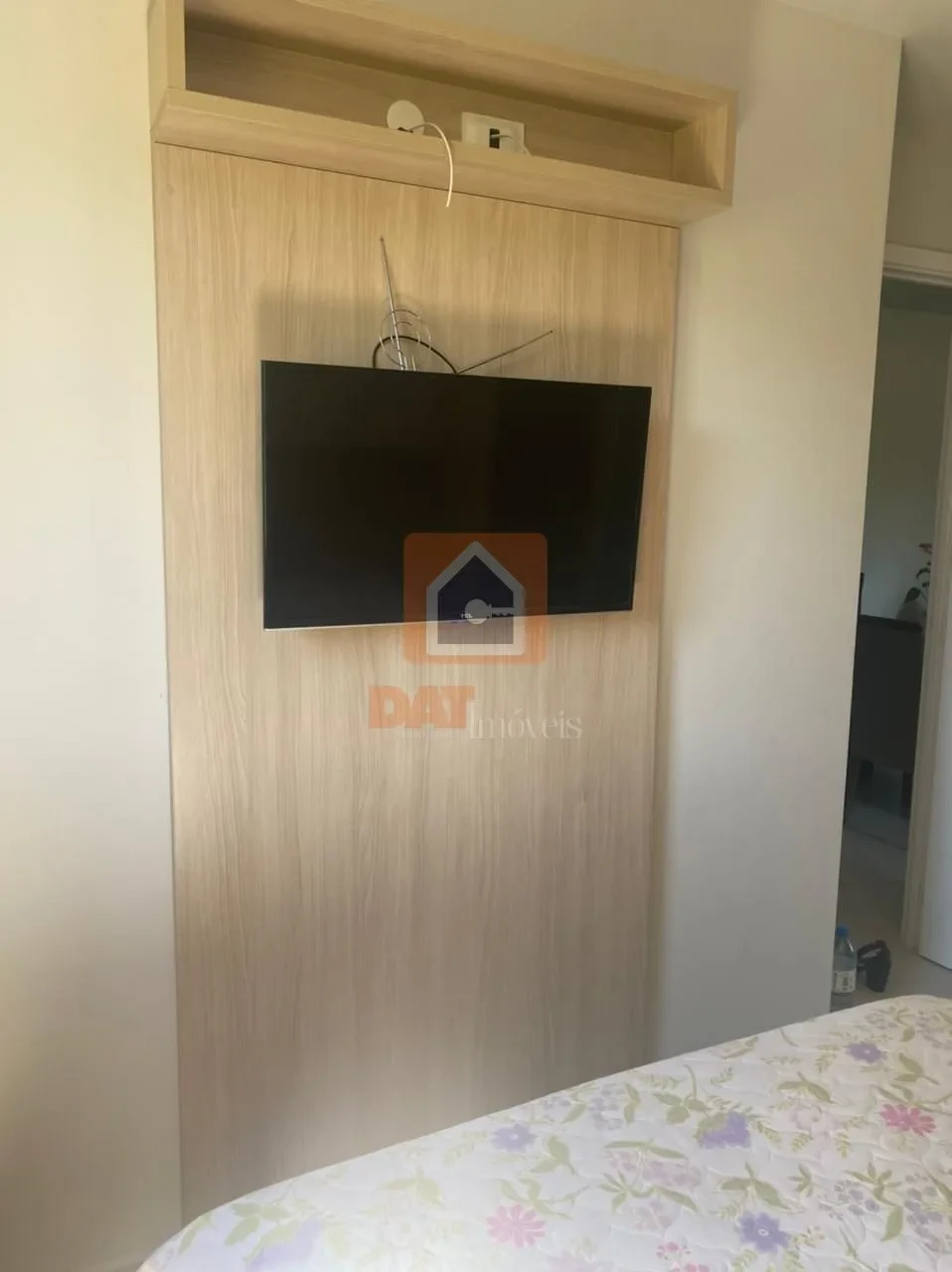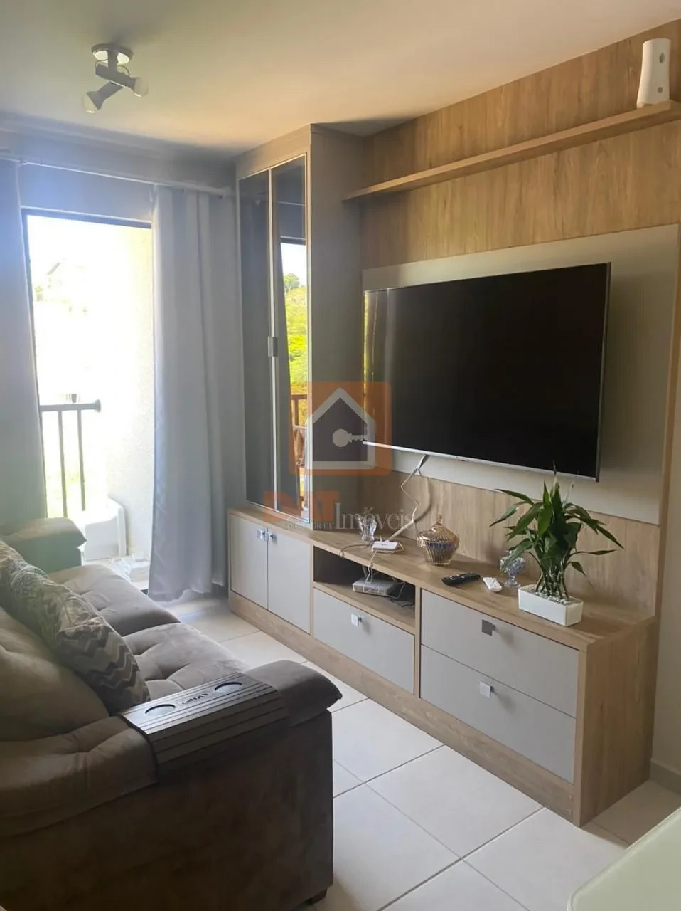 Sala de estar com painel para TV e sala de jantar;