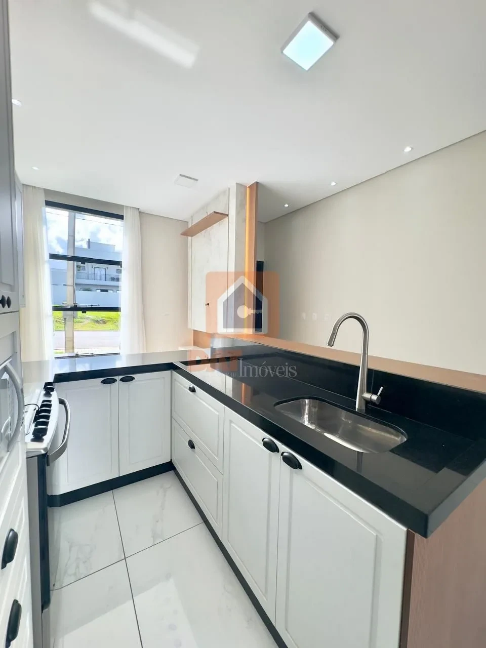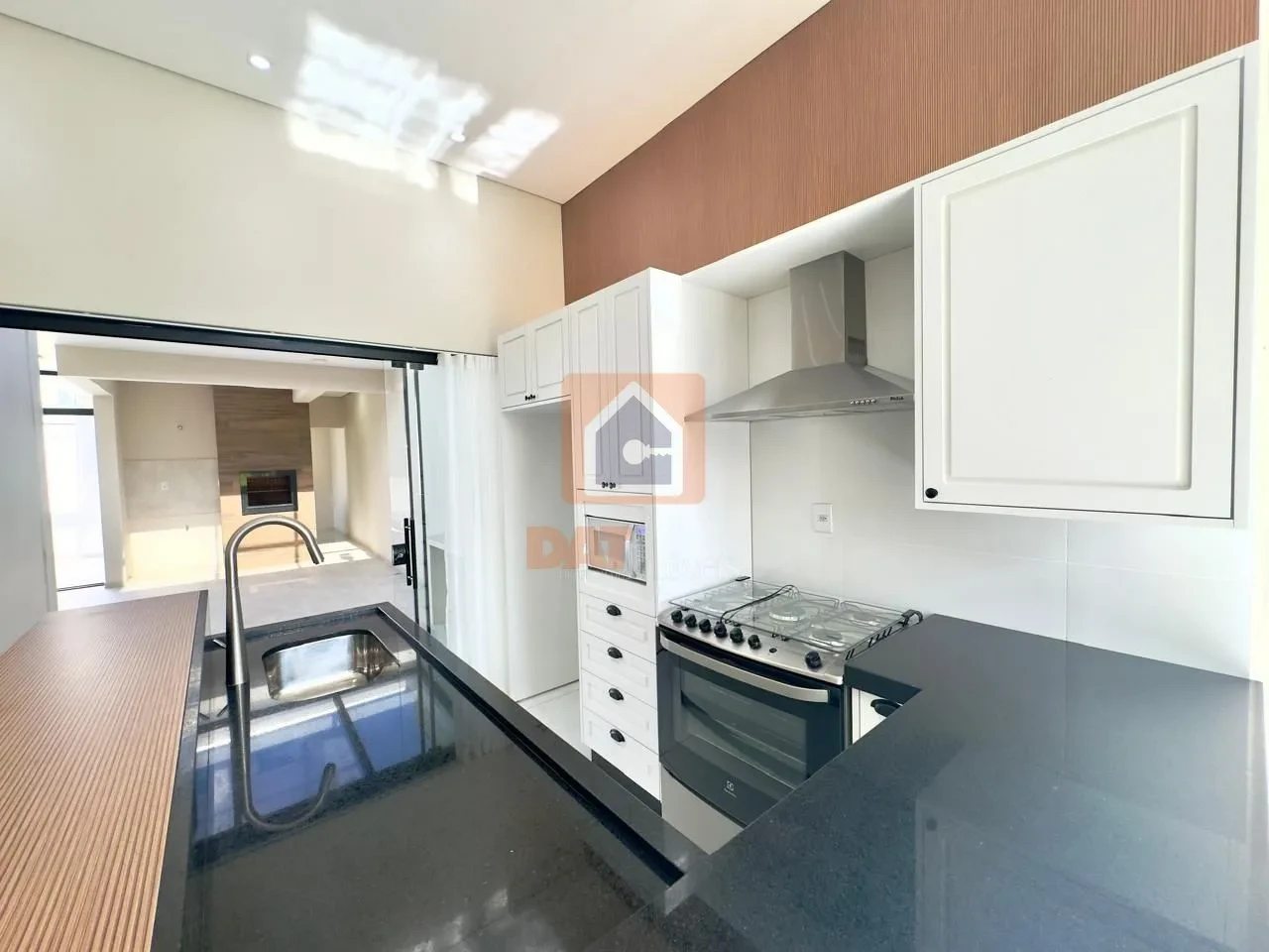 Cozinha americana planejada, equipada com fogão e micro-ondas;
