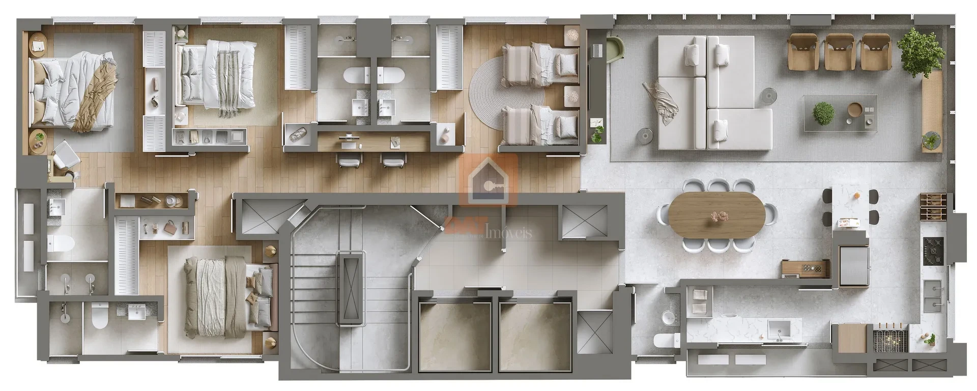 Sala para 3 ambientes, lavabo, cozinha estilo americana com churrasqueira, lavanderia com espaço externo, 4 suítes;