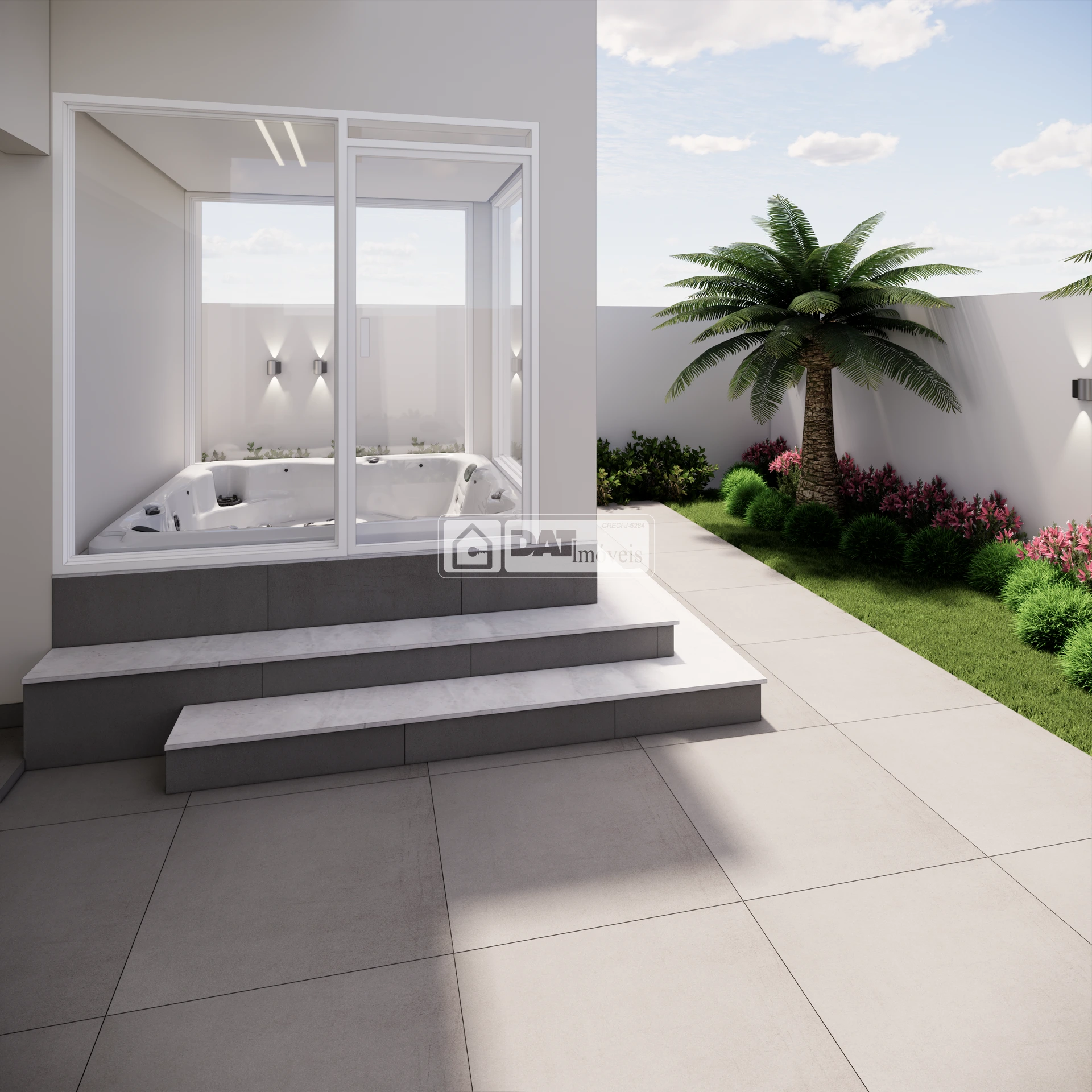 Área gourmet com churrasqueira, área externa com banheira de hidromassagem para 5 lugares.