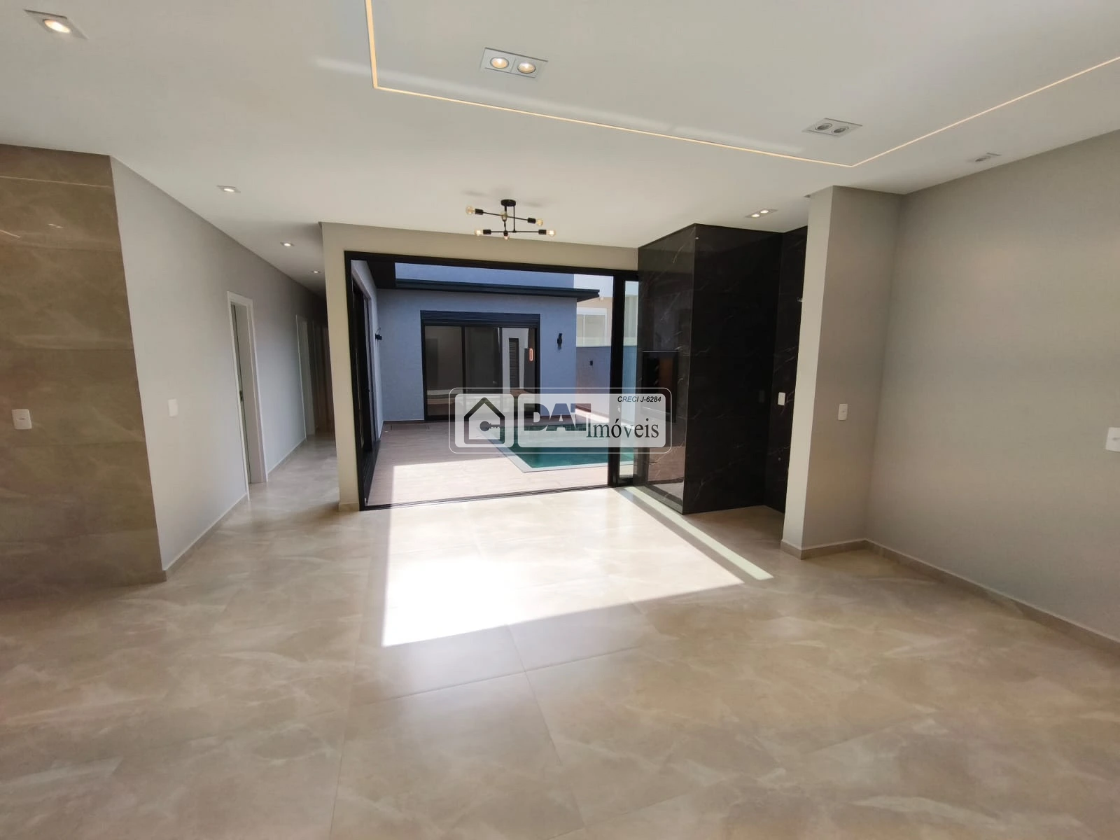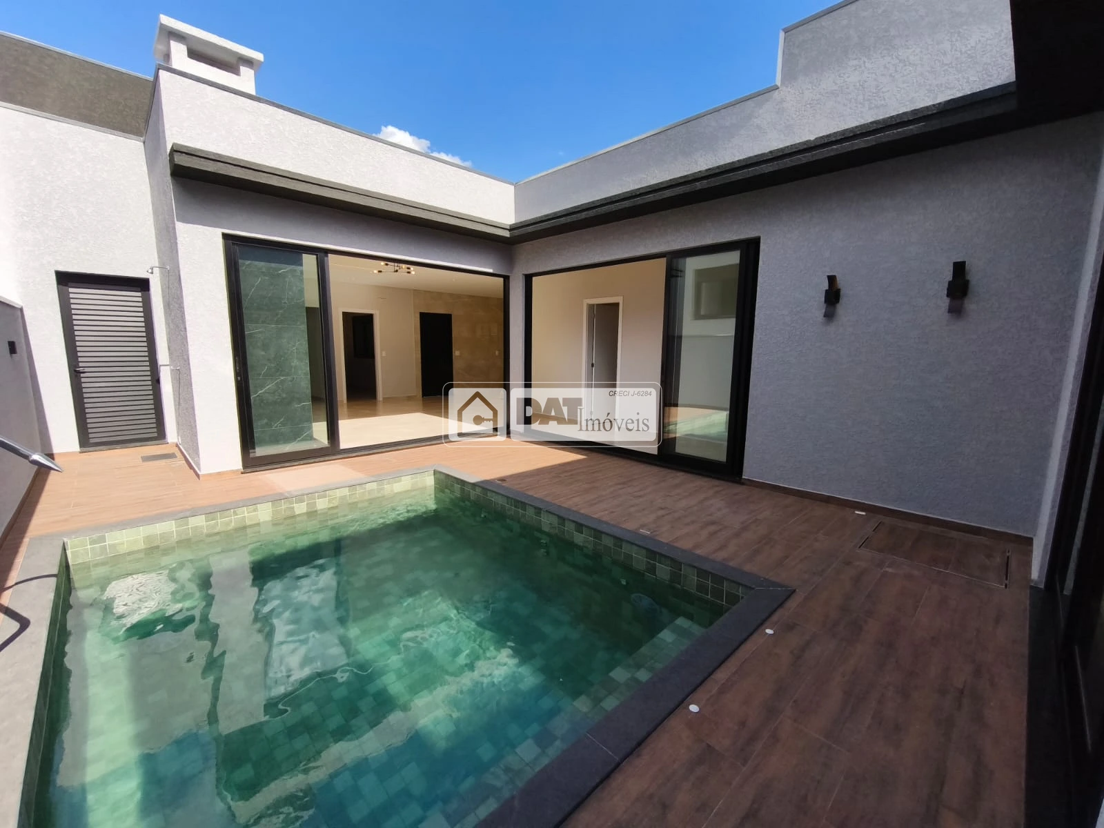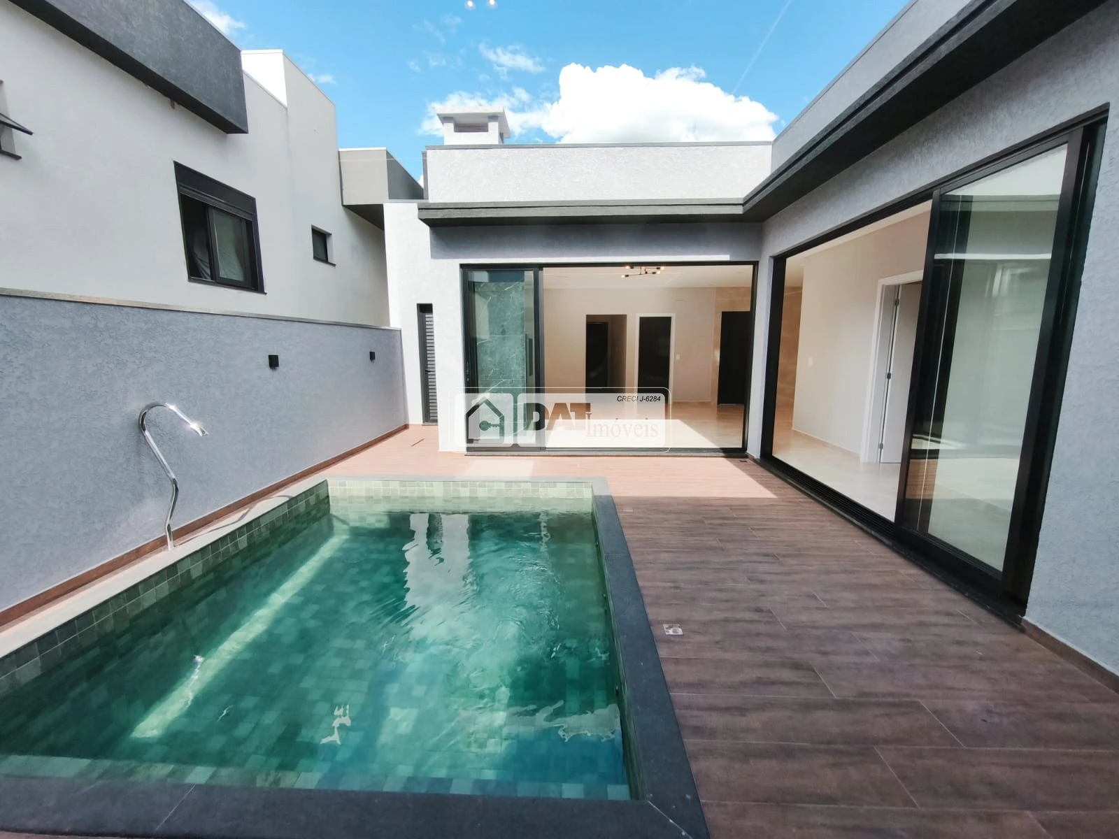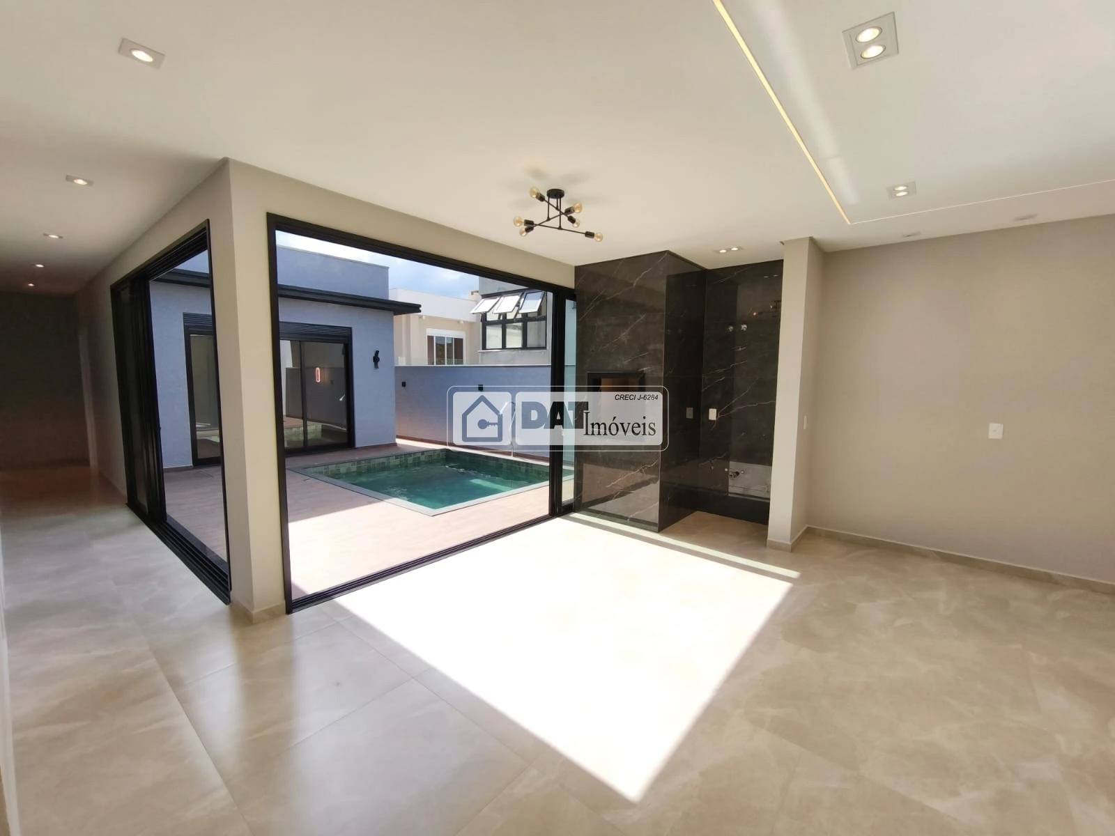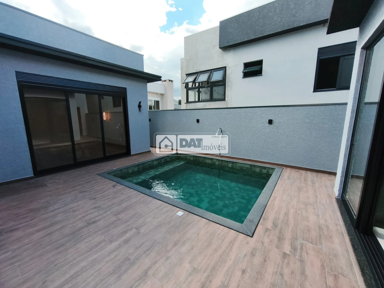Sala de Entrada, cozinha copa com churrasqueira, lavanderia, quatro quartos sendo uma suite, banheiro social, área externa com piscina.