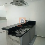 Cozinha com armários planejados e bancada, coifa em inox e cooktop;